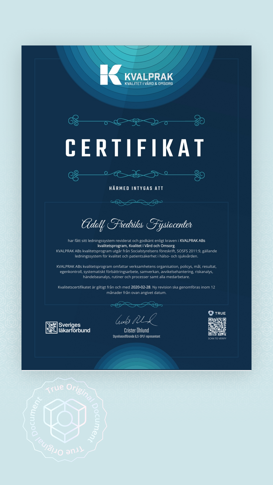 Alla TRUE -document är säkrade med blockchain-teknologi och kan verifieras som äkta. Klicka på verifieringsknappen bredvid dokumentet eller skanna QR-koden med din smartphones kamera. Ingen app krävs - dokumentets äkthet verifieras omedelbart.