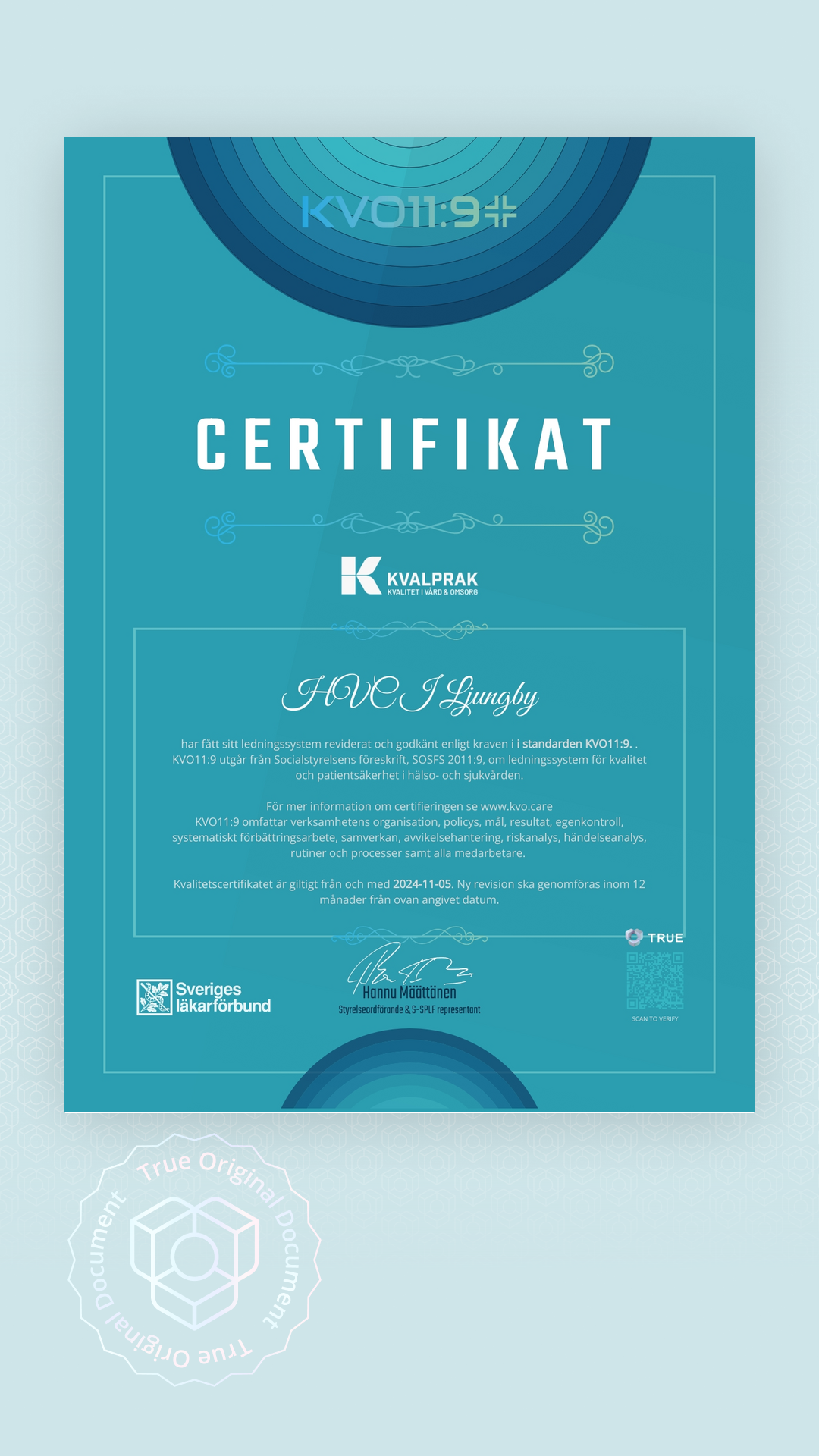 Alla TRUE -document är säkrade med blockchain-teknologi och kan verifieras som äkta. Klicka på verifieringsknappen bredvid dokumentet eller skanna QR-koden med din smartphones kamera. Ingen app krävs - dokumentets äkthet verifieras omedelbart.